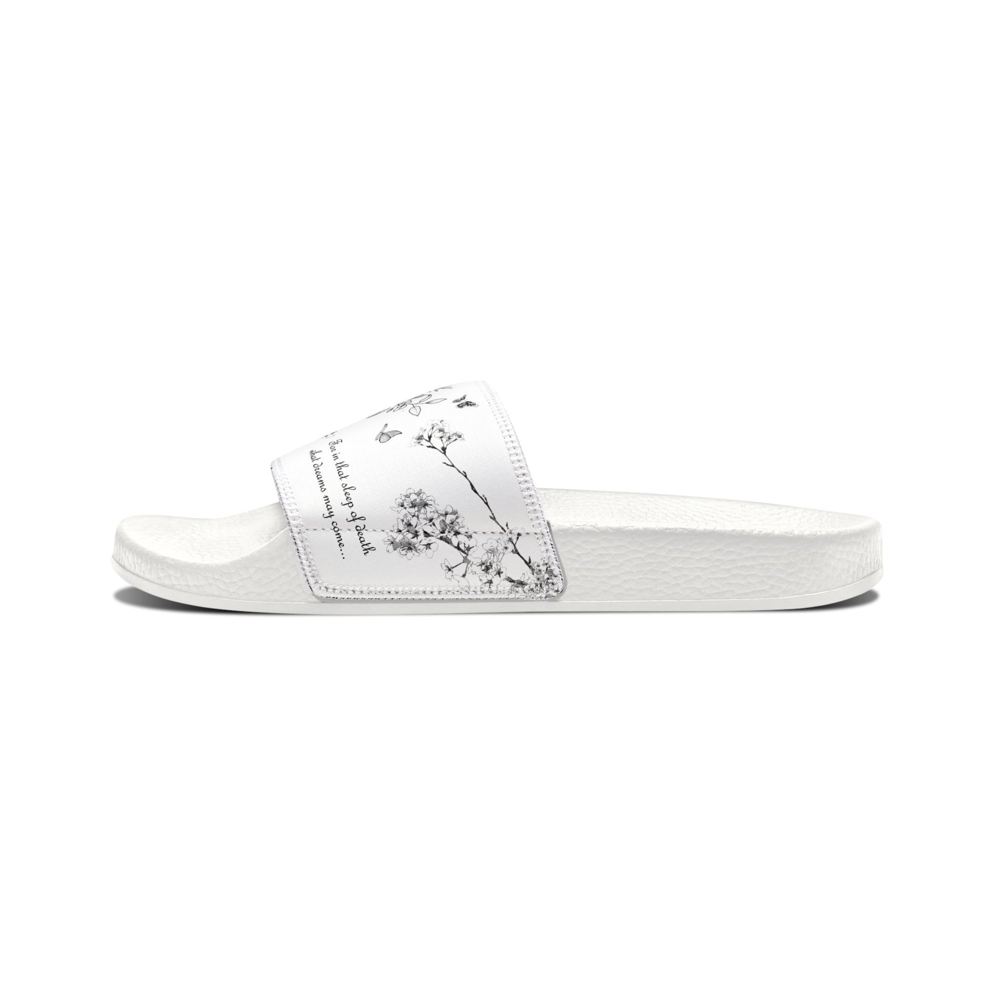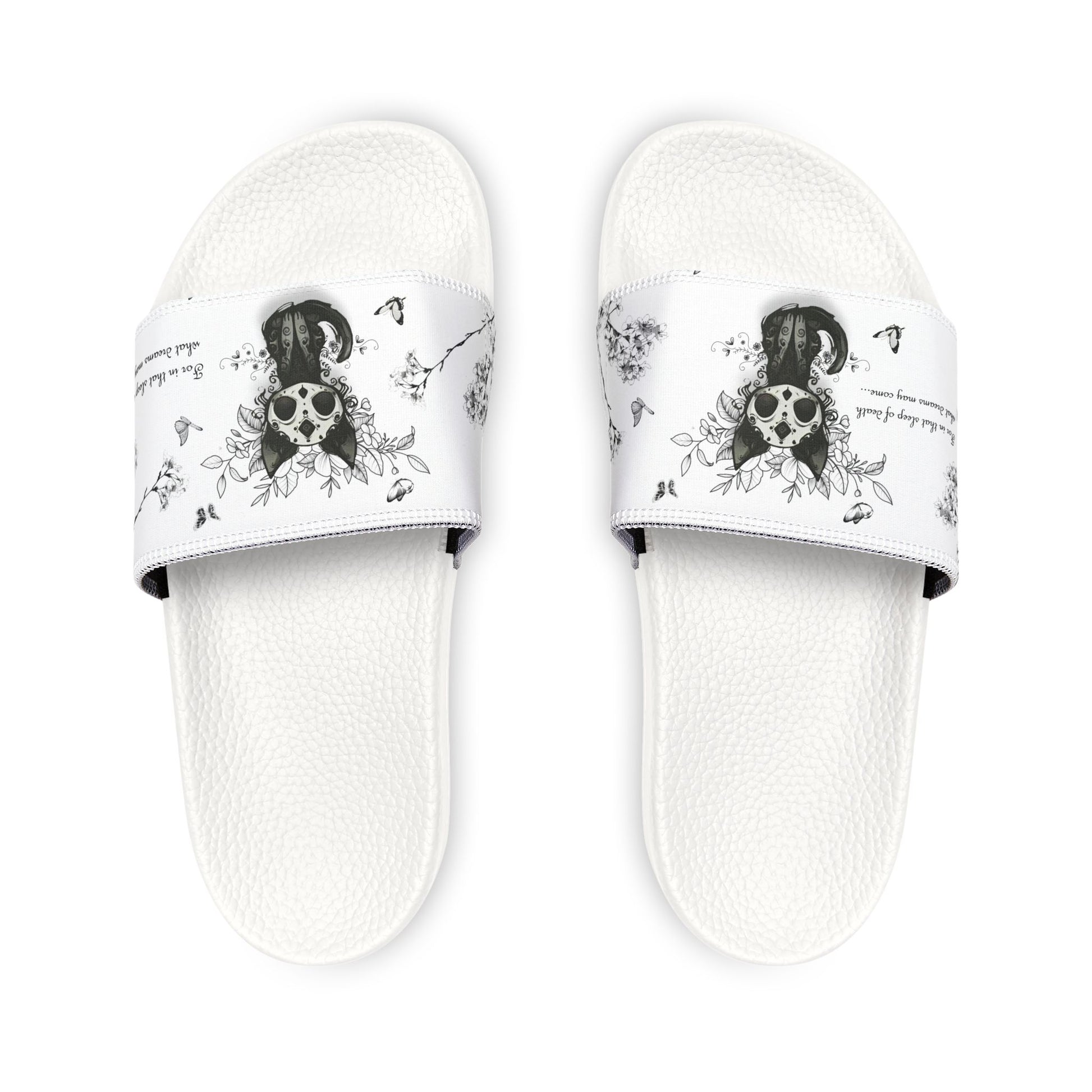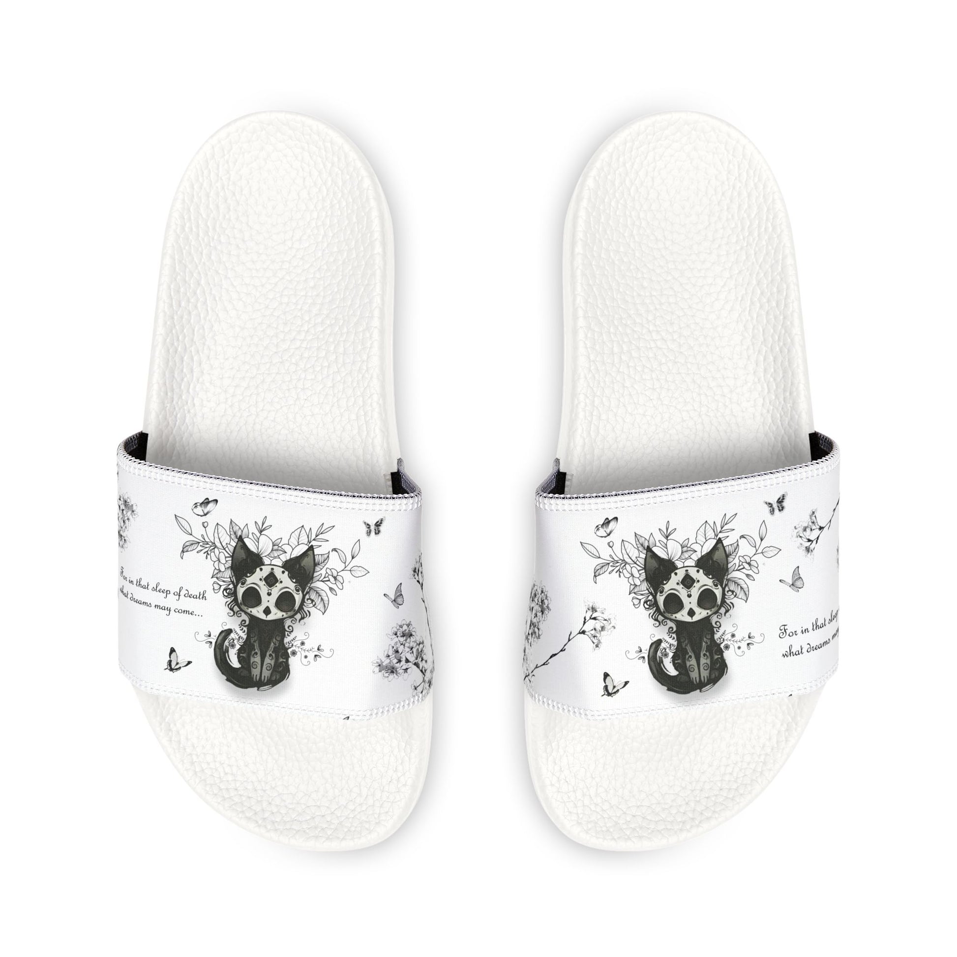 Lightweight yet otherworldly, they feature removable adjustable straps, embossed insoles for grip, and cushioned PU foam soles that whisper rather than clack. Said to echo the Dream Catโs own silent tread through purgatoryโs mist โ soft, unseen, unforgettable.